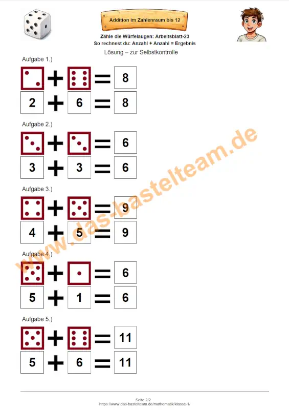 Auf dieser Seite findest du eine große Sammlung an kostenlosen Arbeitsblättern zur Addition im Zahlenraum bis 12. Die Aufgaben basieren vollständig auf Würfelbildern ⚀ ⚁ ⚂ ⚃ ⚄ ⚅, sodass Kinder der 1. Klasse spielerisch und anschaulich das Addieren üben können. Durch die vertrauten Würfelaugen fällt es vielen Schülern leichter, Mengen schnell zu erfassen und Rechenstrategien zu entwickeln.