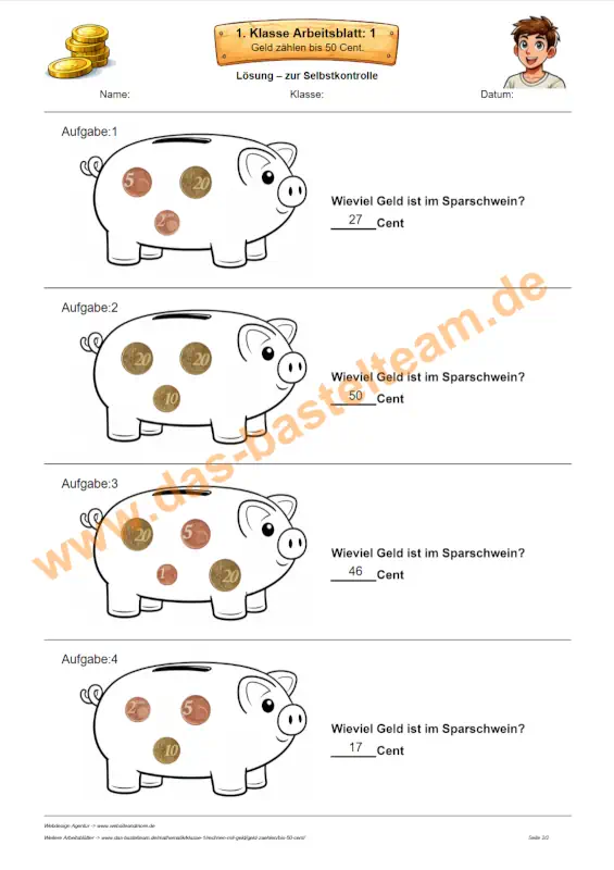 Diese Arbeitsblätter sind ein wichtiger Schritt auf dem Weg zum Rechnen mit Geld. Sie bauen auf dem Zuordnen der Münzen auf und bereiten auf weiterführende Aufgaben mit höheren Geldbeträgen vor.