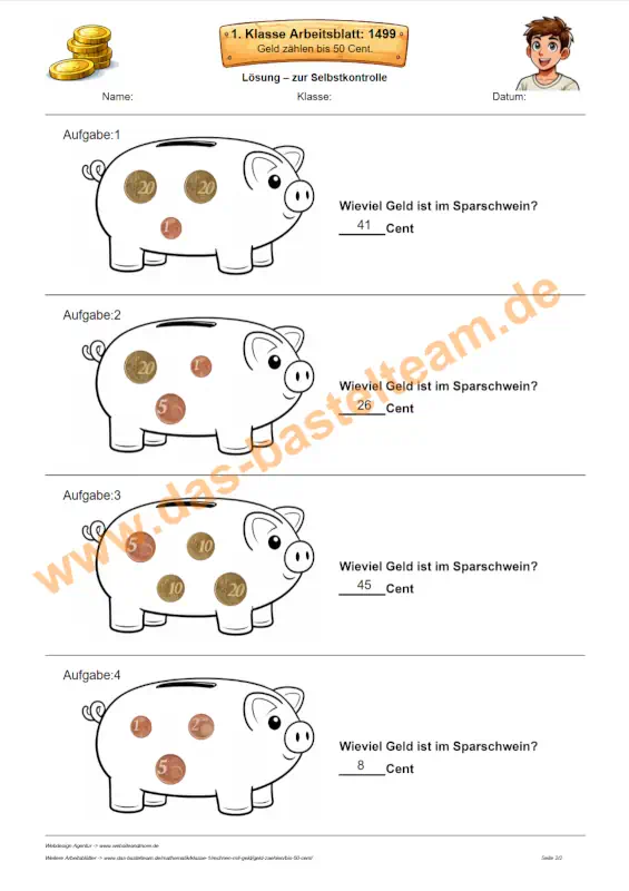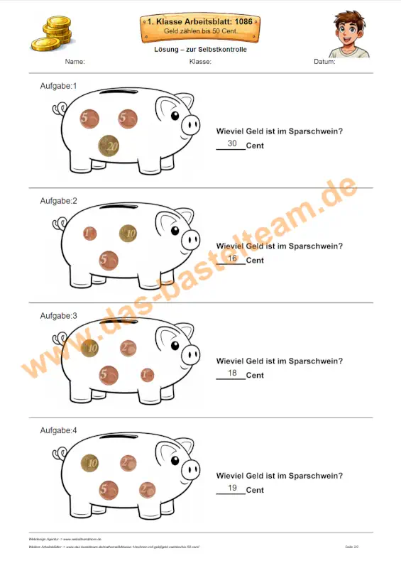 Auf dieser Seite stehen dir über 1500 verschiedene PDF-Arbeitsblätter zur Verfügung. Alle Arbeitsblätter folgen dem gleichen klaren Aufbau, unterscheiden sich jedoch in der Zusammenstellung der Münzen.