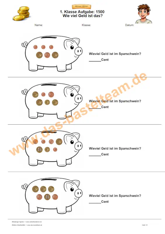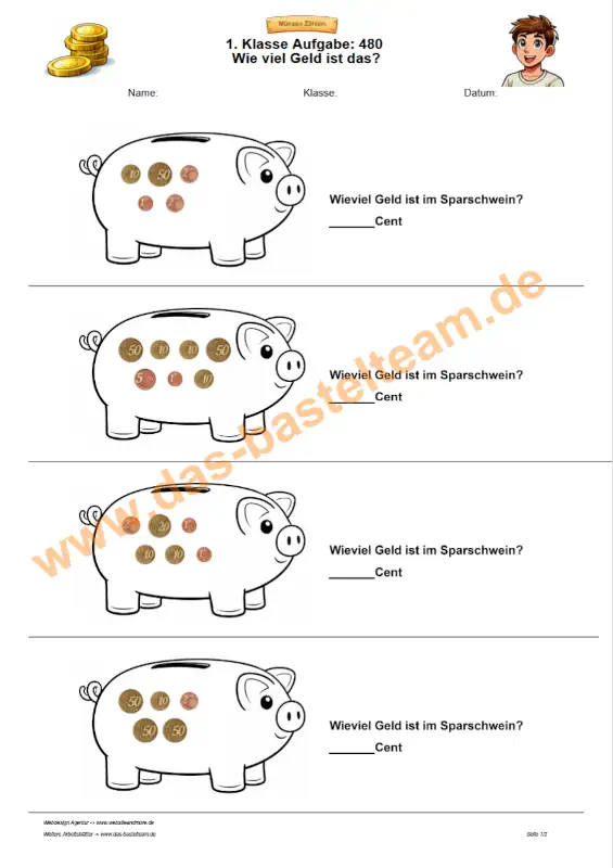 Auf dieser Seite finden Sie eine große Auswahl an Arbeitsblättern zum Geld zählen über 1 Euro. Die Aufgaben richten sich an Schülerinnen und Schüler der 1. Klasse und bauen auf dem sicheren Umgang mit Cent-Beträgen auf.