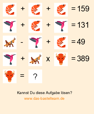 Entdecke die Welt der Rechenrätsel mit unseren Motiv Tiere! Fordere Dein Gehirn heraus und trainiere Deine Mathekenntnisse mit spannenden Aufgaben, die sowohl Zahlen als auch Bilder beinhalten. Unsere einfachen Grundrechenarten machen das Lösen zu einem unterhaltsamen Vergnügen für die ganze Familie. Nutze unsere Rechenrätsel als kleinen Denksport und verbesser Deine Mathematikfähigkeiten. Komm und probiere es jetzt aus!